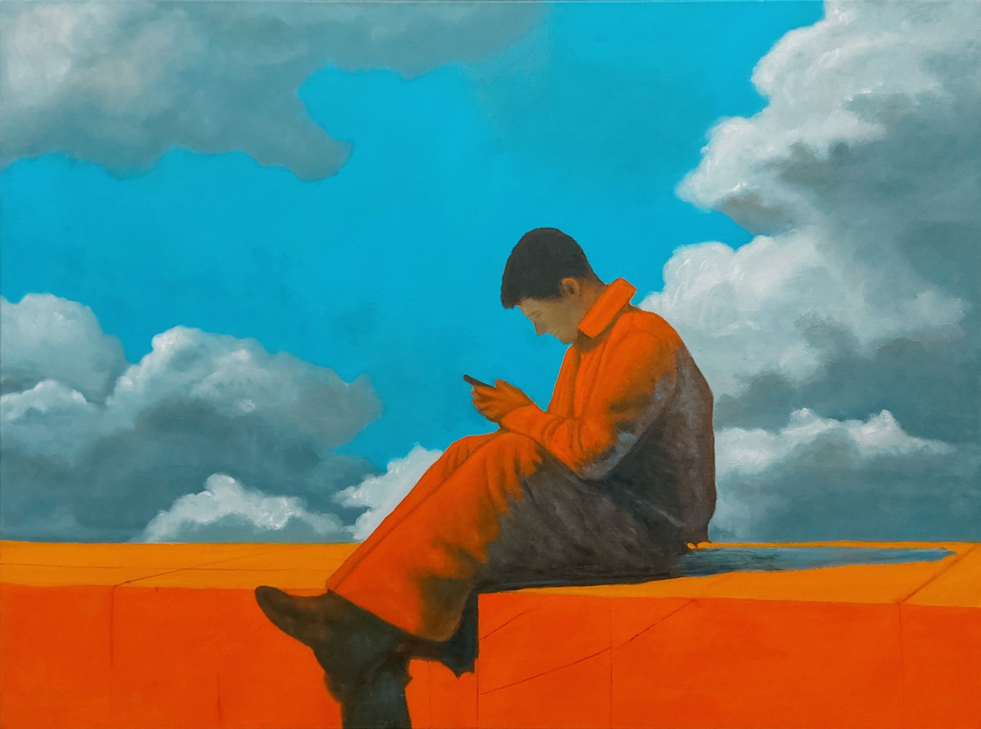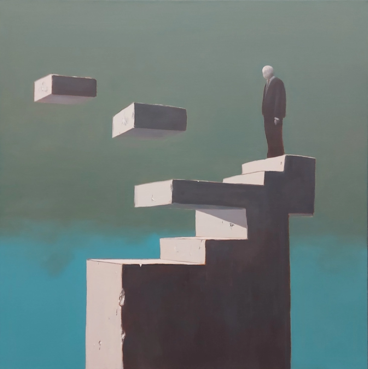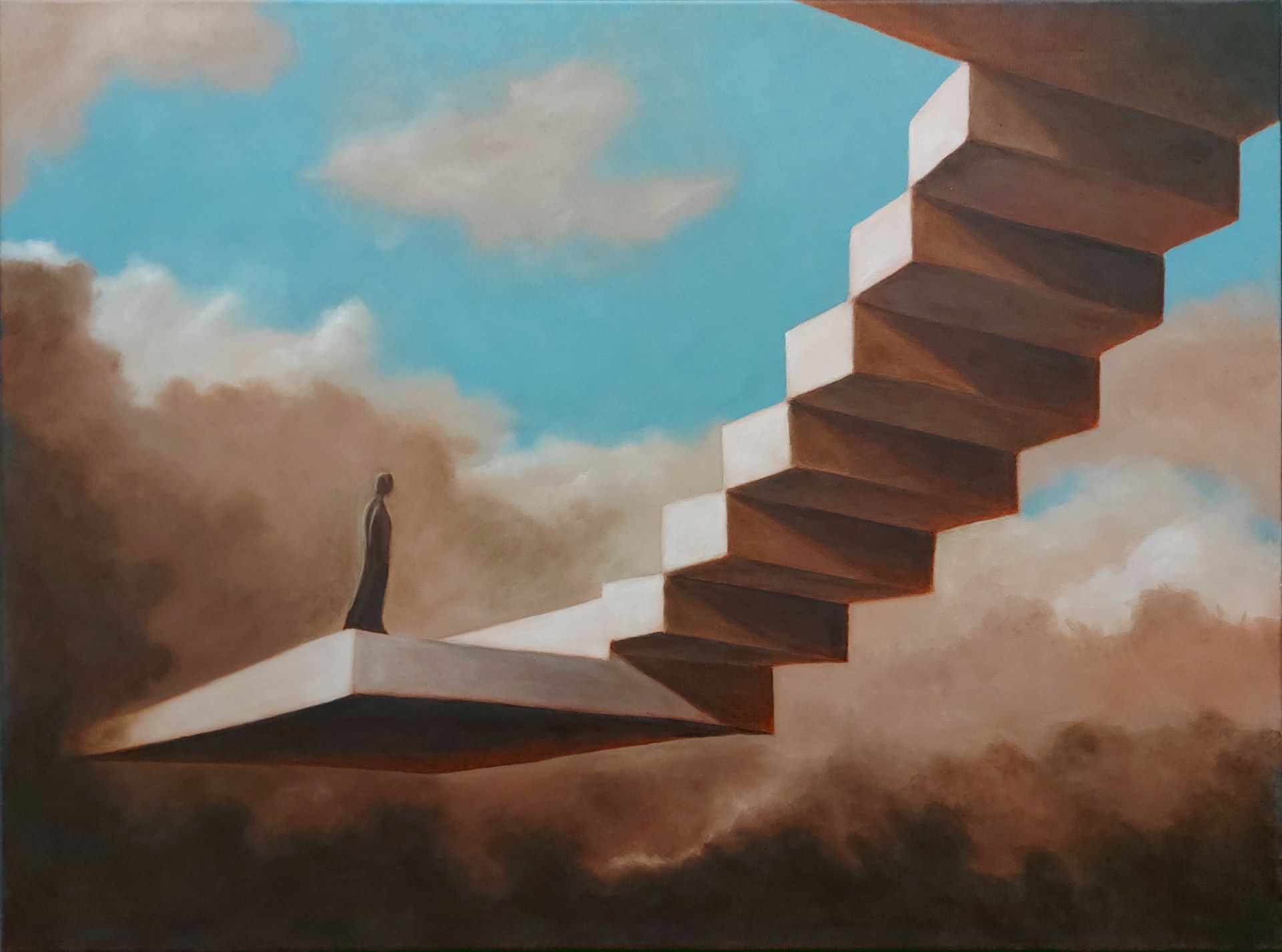 His process begins with an idea that undergoes multiple compositional studies before becoming a carefully constructed grisaille. Subsequent layers are built gradually, often with a limited but purposeful palette, including his trusted white, Payne’s grey, ultramarine or royal blue, burnt sienna, umber, and yellow ochre.